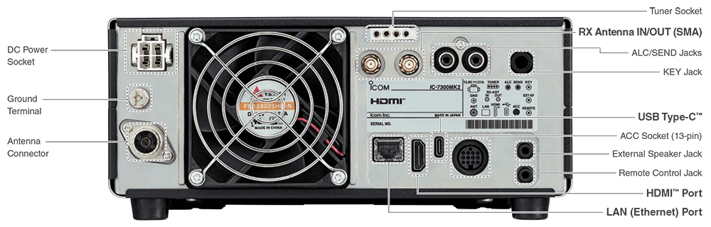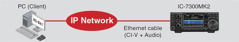 Porta Ethernet LAN integrata (stessa funzione del IC-7610) per un facile funzionamento remoto con RS-BA1 versione 2 (opzionale); il ricetrasmettitore è gestibile via rete/Internet — compresa accensione/spegnimento — senza alcun PC server in stazione