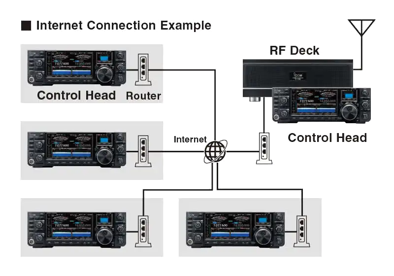 L’unità di controllo e il deck RF possono essere connessi tramite Internet o tramite una rete LAN domestica (cablata o Wi-Fi®). Questo concetto aumenta la flessibilità di installazione della stazione, liberando più spazio sulla scrivania grazie al posizionamento del deck RF più vicino al punto di alimentazione dell’antenna. Oltre alla funzione di connessione diretta, è possibile posizionare il deck RF presso la stazione HF remota e gestire un telecomando completo con l’unità di controllo a casa.